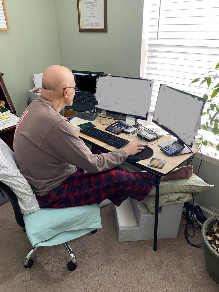 George was still dealing with pain in his leg. He was able to hobble around better without using his cane, but it was still difficult. We moved him to the bedroom upstairs so he wouldn’t have to go up and down and fixed his home office with a pillow for his leg.