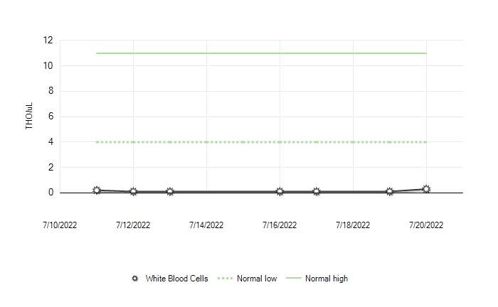Also, his absolute neutrophil count (ANC) has gone from zero to 10! The neutrophil is the most important infection- fighting white blood cell. The normal range is 2,500 – 6,000, but I think George can be discharged once his count reaches >500.