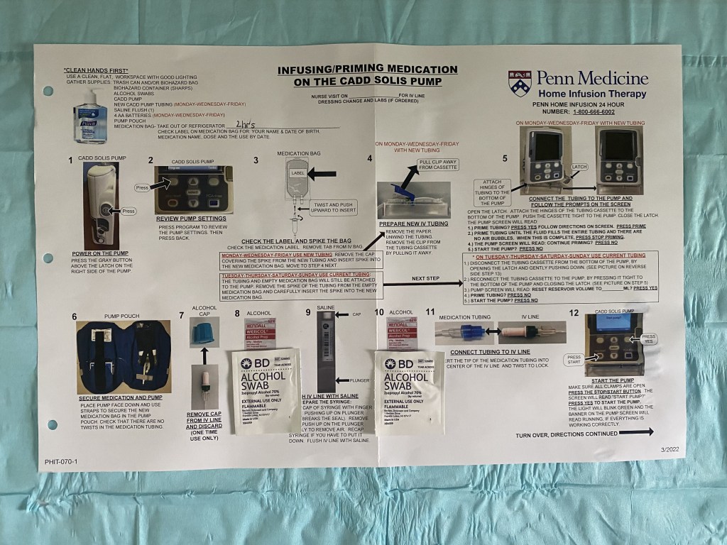 At around 10:30, the UPenn Home Infusion nurse, Amanda showed up to show us how to clean George’s PICC line and hook up his magnesium infusions. We took the magnesium out of the fridge about 2 hours before Amanda got there so it wouldn’t feel like George was getting ice water pumped into his veins. She then demonstrated how to turn on the pump, prime the pump, and get the IV started.