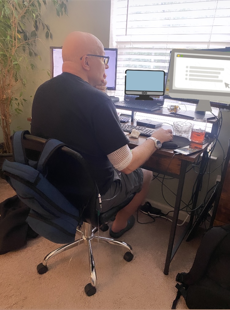 Since we are at home, we don’t have an IV pole. Instead, we have a little backpack that holds the pump. It’s great, because George can move around easily. Here, he is sitting at his desk working while receiving his transfusion! His pump is in the backpack on the back of his chair.