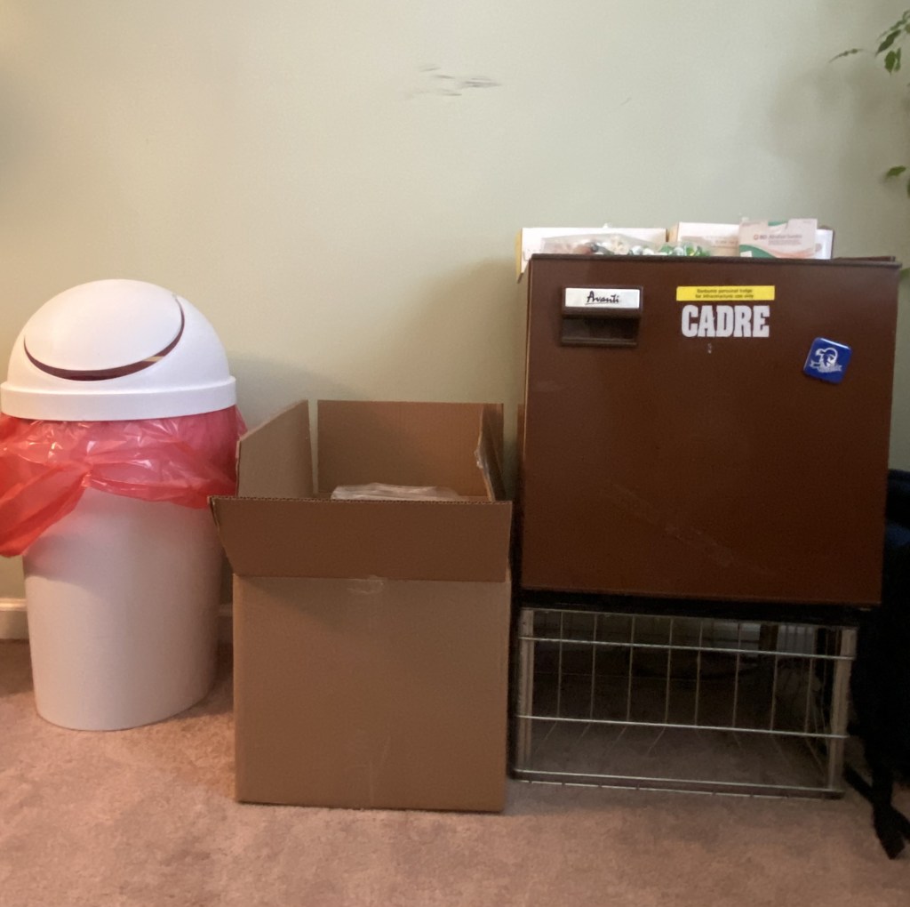 At about 7:30 the evening of his homecoming, we received a delivery from UPenn Home Infusion. In the box were bags of magnesium, an infusion pump, saline and heparin syringes to flush George’s PICC line, alcohol swabs, tubing and everything we would need to care for him at home. The magnesium bags have to refrigerated so we got the mini fridge we had in the garage and brought it into the office. We opened the box and set up our little infusion center. The bags of magnesium are pretty big and take up too much room in our kitchen refrigerator!