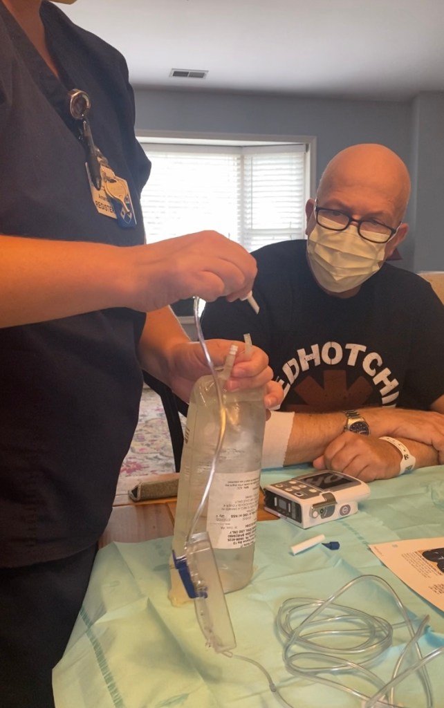 George has been home for only two days, but it’s pretty remarkable how quickly we have settled into this new routine of taking medication and hooking up the infusion bag in the morning after coffee. We will be doing this every day for at least the next three months.