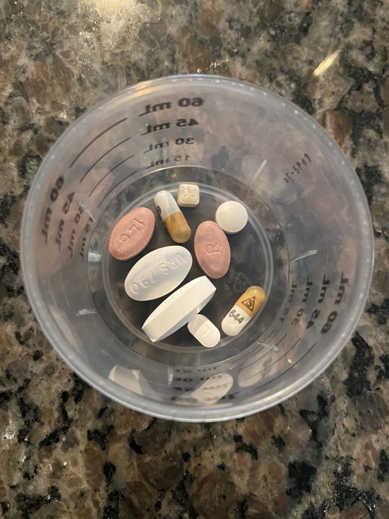 When I get back from my walk, we get George hooked up to his magnesium infusion (which will run for 4 hours) and then I make him breakfast and get him his morning pills.