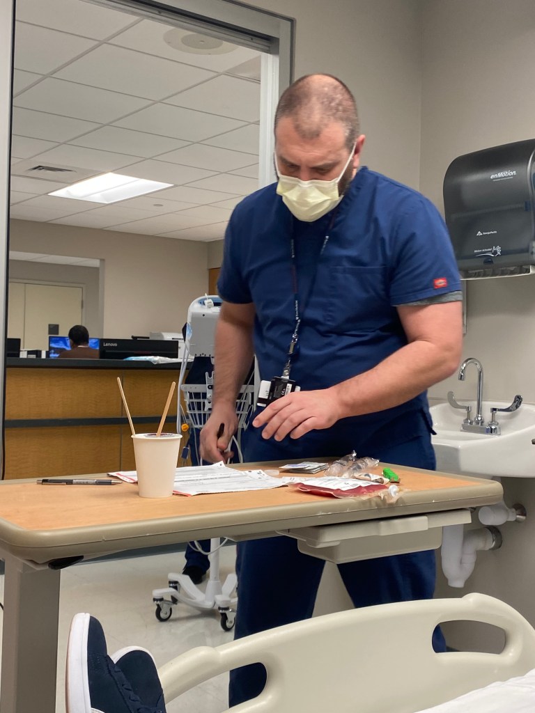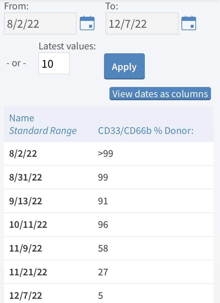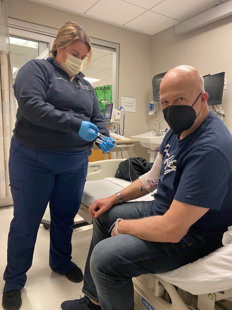 Waiting in the aphaeresis unit, while George was getting 250 ml of saline to hydrate him, we asked the nurse why George was only getting infused with T-cells (CD3 cells) when his percentage of those cells was 96% donor, yet his CD33-34 (myeloid cells) were now only FIVE PERCENT donor? Seems like they would want to give him a boost of THOSE cells!